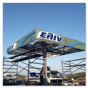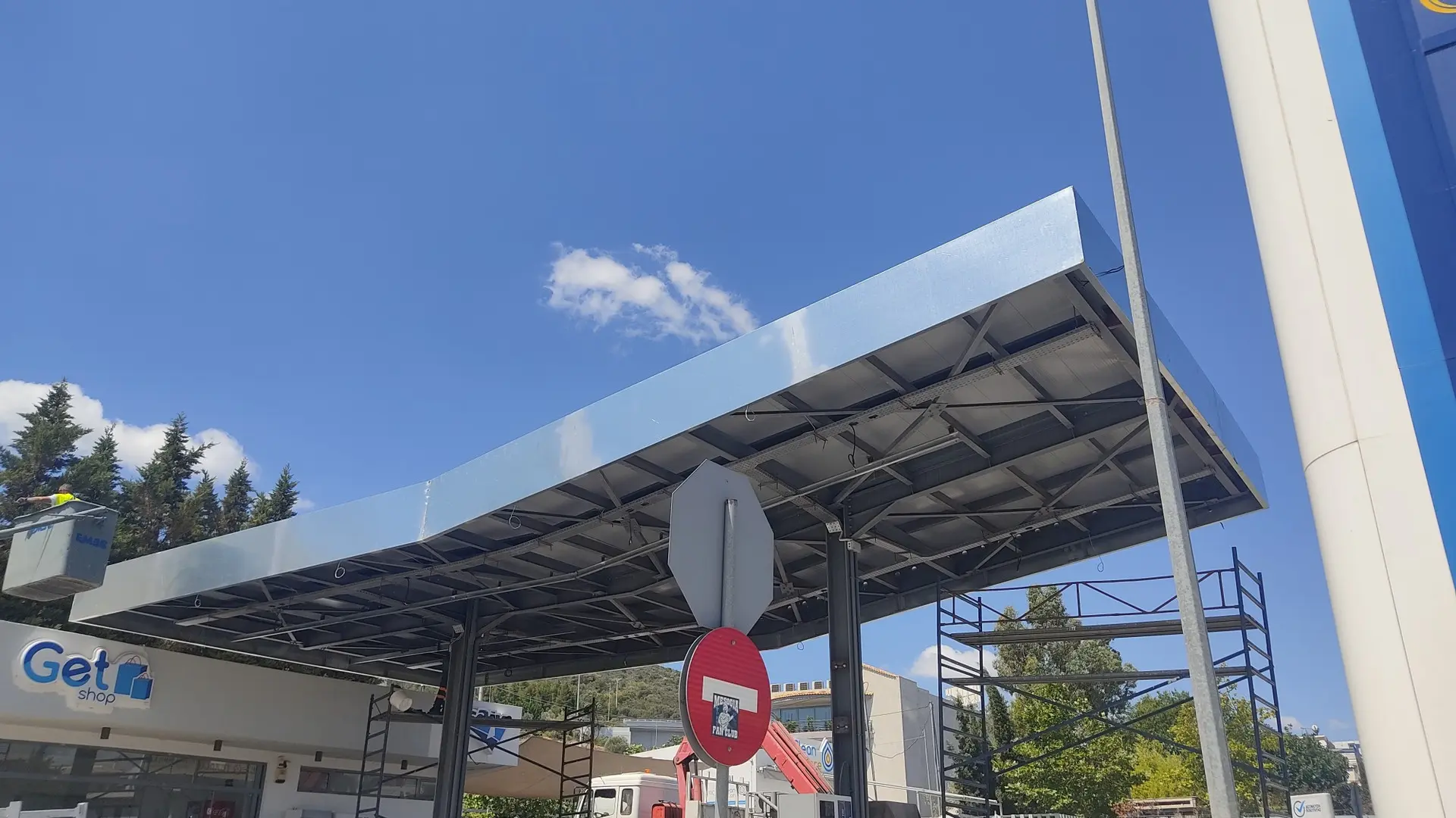 The metal canopy of the petrol stations is synonymous with our company. The canopy of the fuel pumps may be single-column, double-column or poly-column of various measurements. It consists of double ceiling. It is delivered with the pre-painted linear metal ceiling, which is custom-made so that it creates a flat surface, the ceiling made from trapezoidal galvanised sheet metal and the galvanised fronts. The construction is fully modular.
