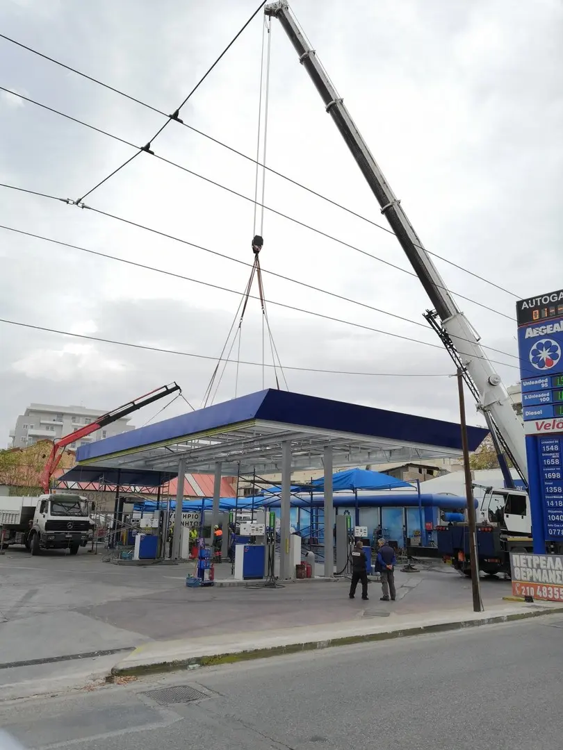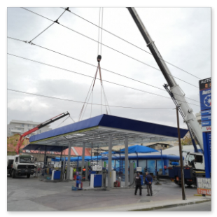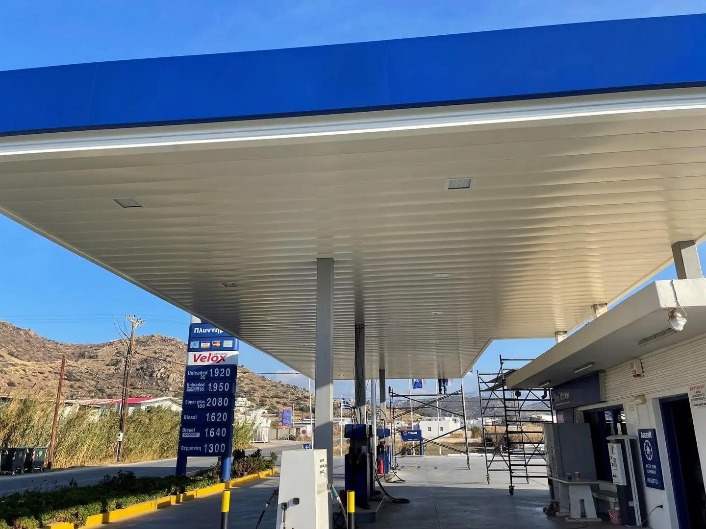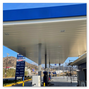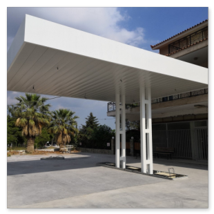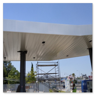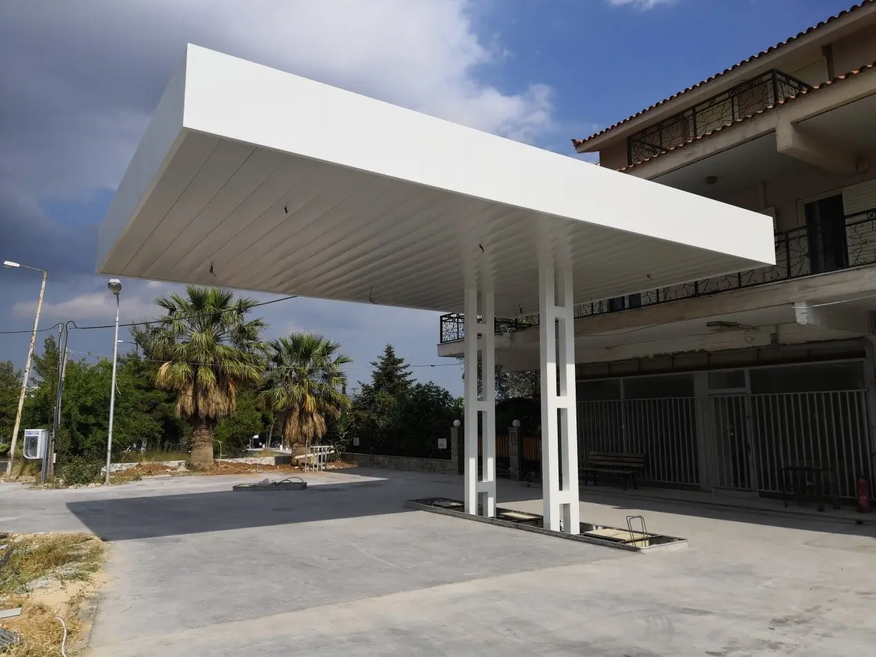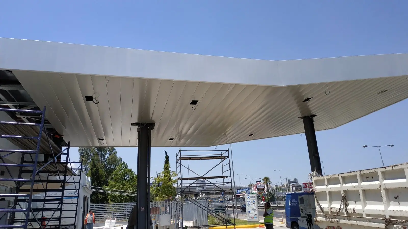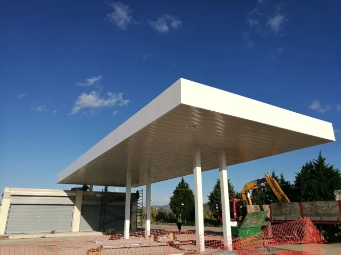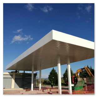 The metal canopy of the petrol stations is synonymous with our company. The canopy of the fuel pumps may be single-column, double-column or poly-column of various measurements. It consists of double ceiling. It is delivered with the pre-painted linear metal ceiling, which is custom-made so that it creates a flat surface, the ceiling made from trapezoidal galvanised sheet metal and the galvanised fronts. The construction is fully modular.
