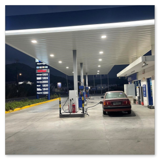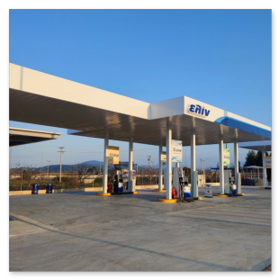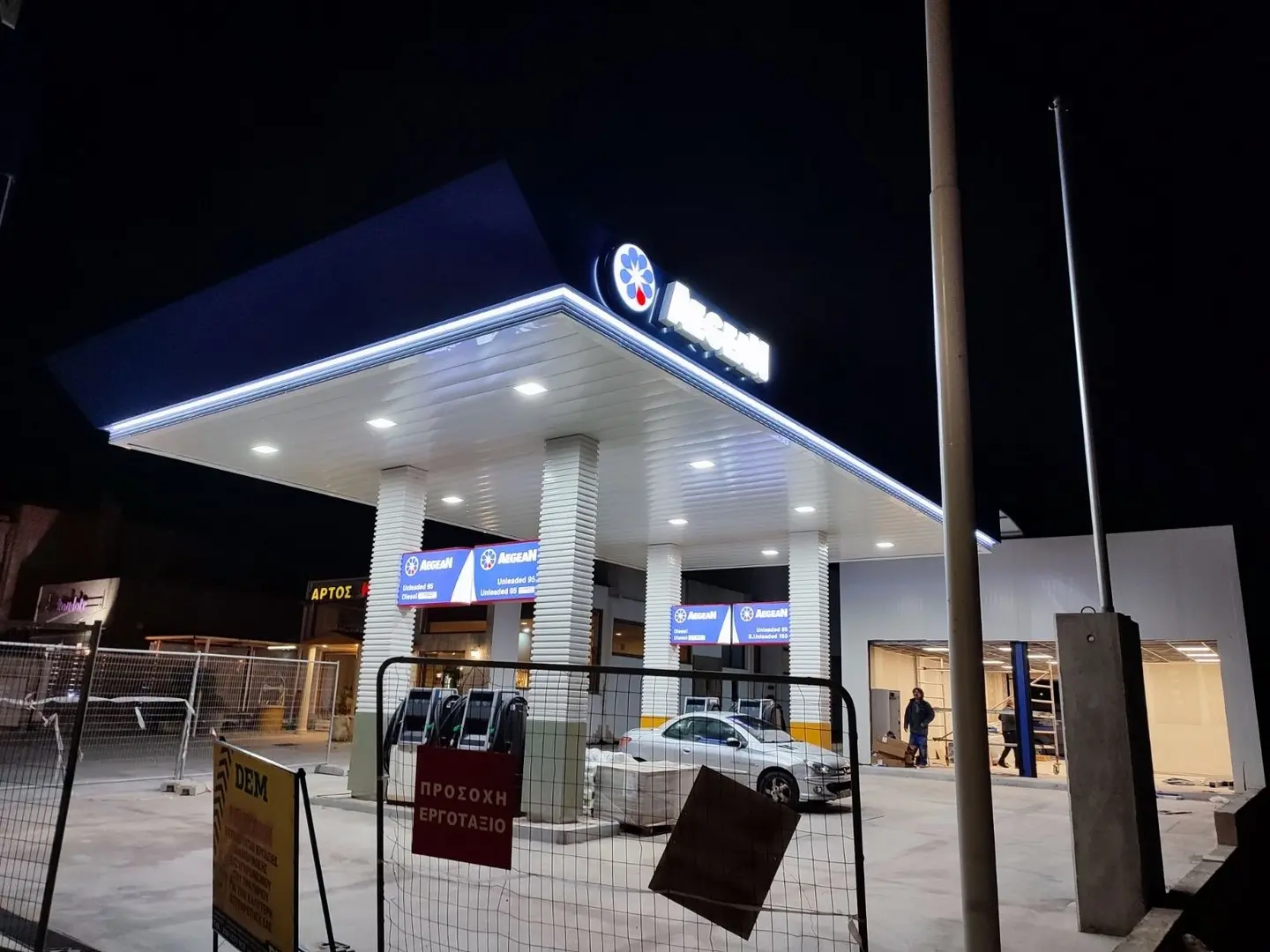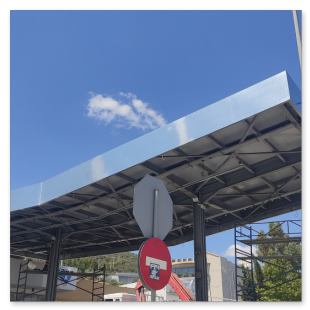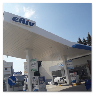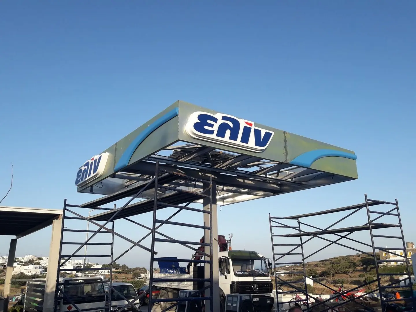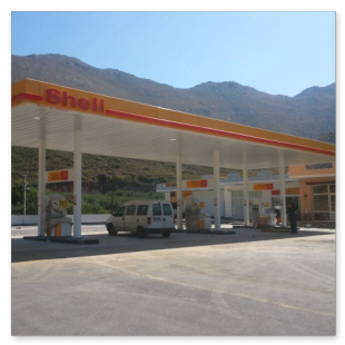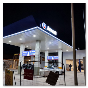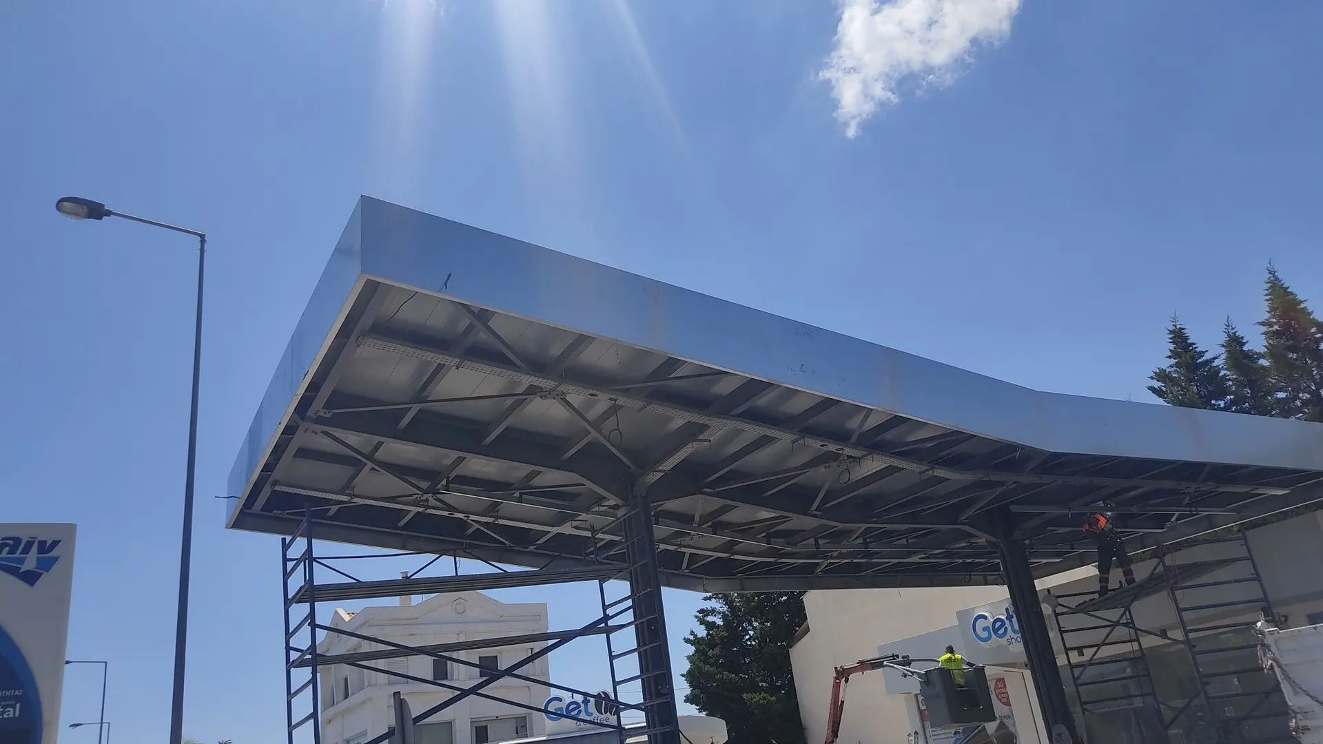 The metal canopy of the petrol stations is synonymous with our company. The canopy of the fuel pumps may be single-column, double-column or poly-column of various measurements. It consists of double ceiling. It is delivered with the pre-painted linear metal ceiling, which is custom-made so that it creates a flat surface, the ceiling made from trapezoidal galvanised sheet metal and the galvanised fronts. The construction is fully modular.